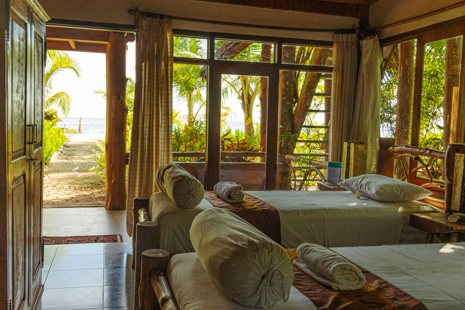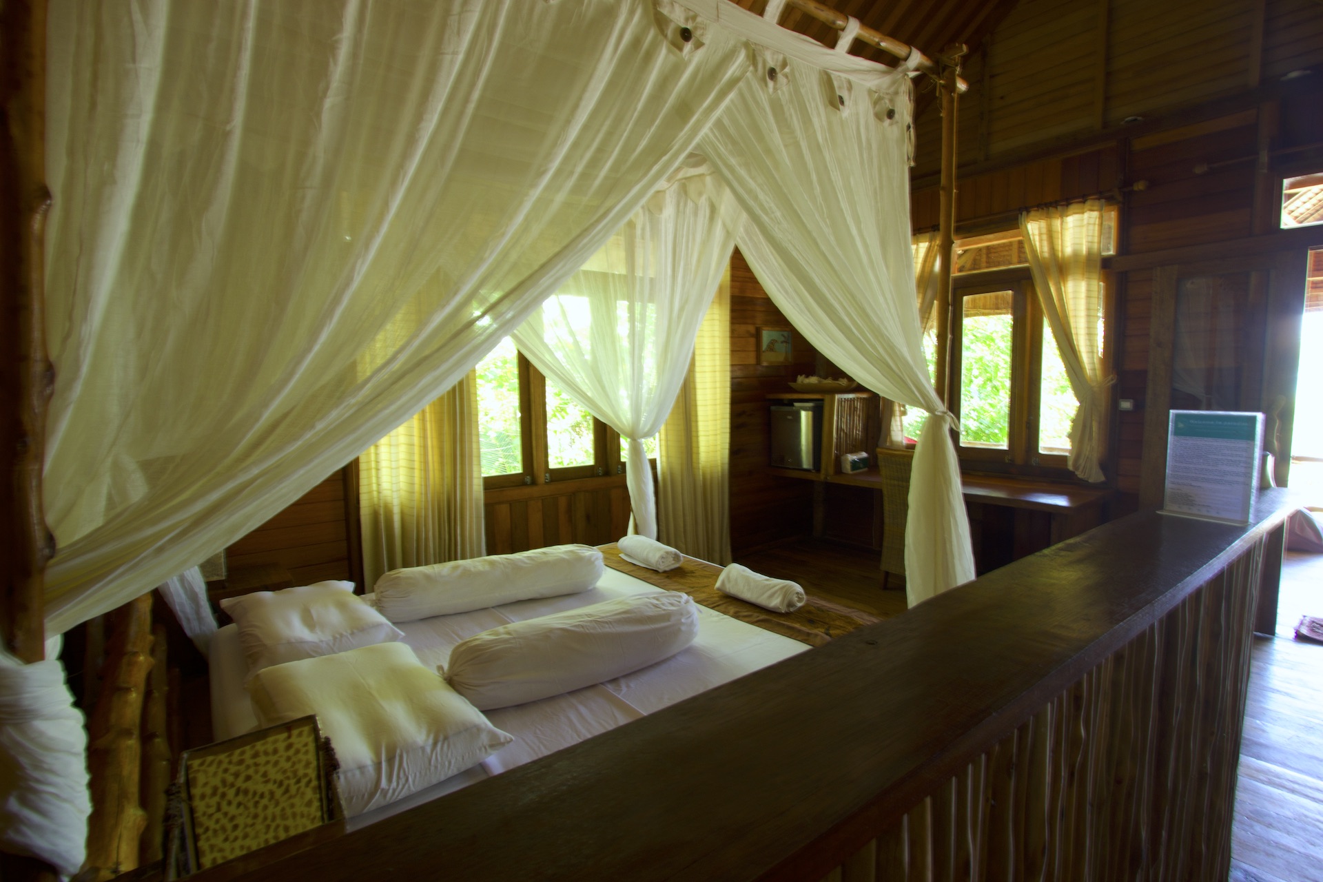 Orthopaedic mattresses, 400 thread count sheets, air conditioning and hot water (all rooms beside Santai Bungalows), mini-bar, a private bathroom and differentiated lighting decoration, ensure the welfare and comfort of guests. All the furnishings were made at the island resort using wood found on the beach ensuring a rustic and unique design.
