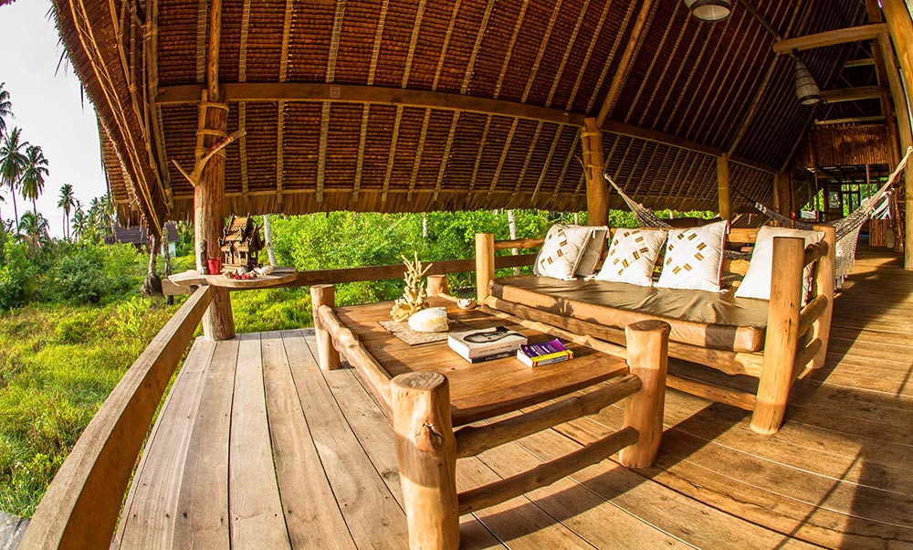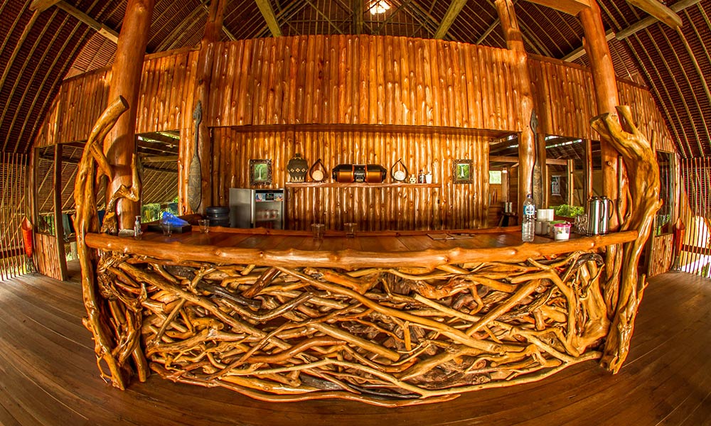 On the second floor, you’ll discover several lodges, dining tables, and a unique bar crafted from wood collected from the beach.