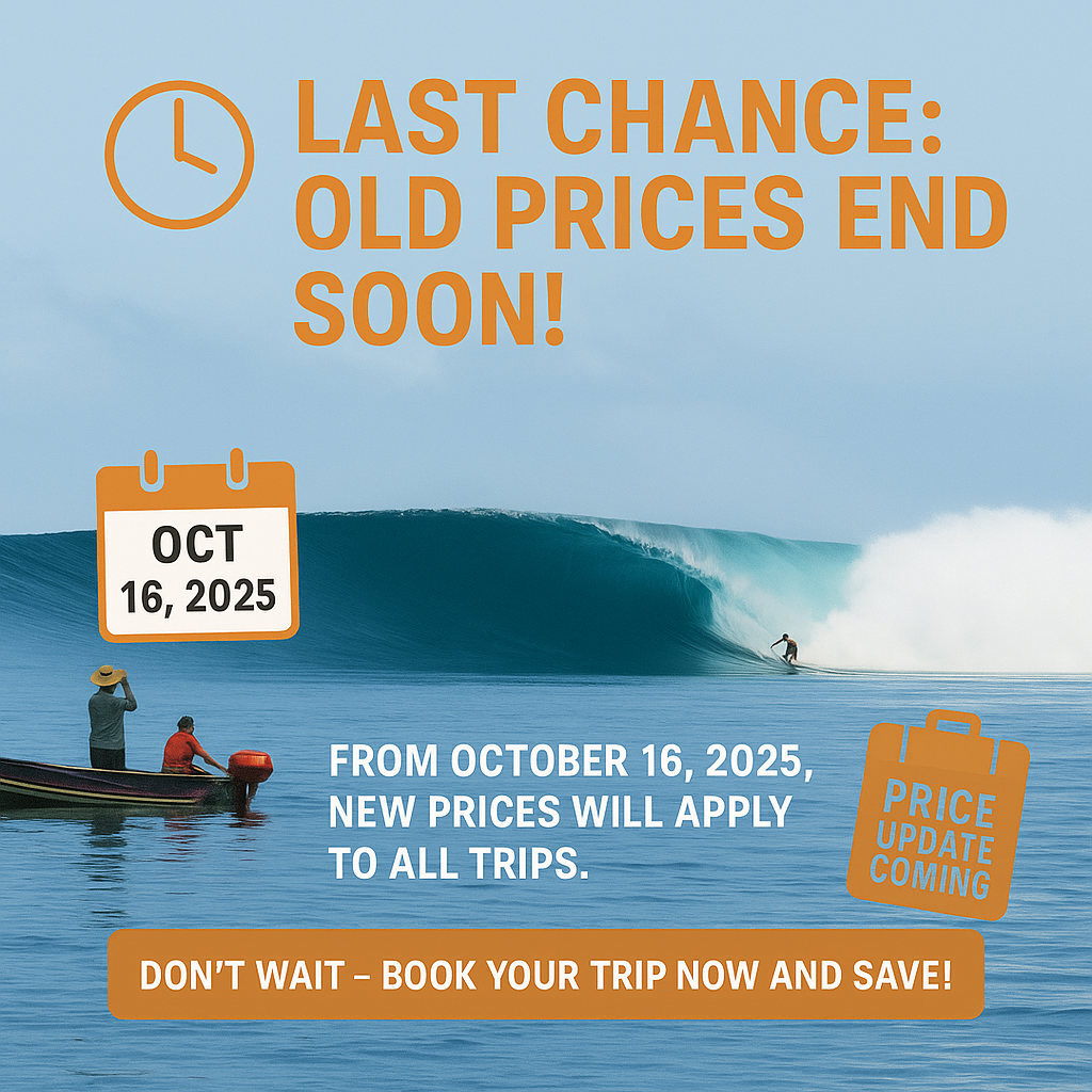 - Rp 2,000,000 (~USD 137) Mentawai Surf Tax, to be paid at Padang Harbor